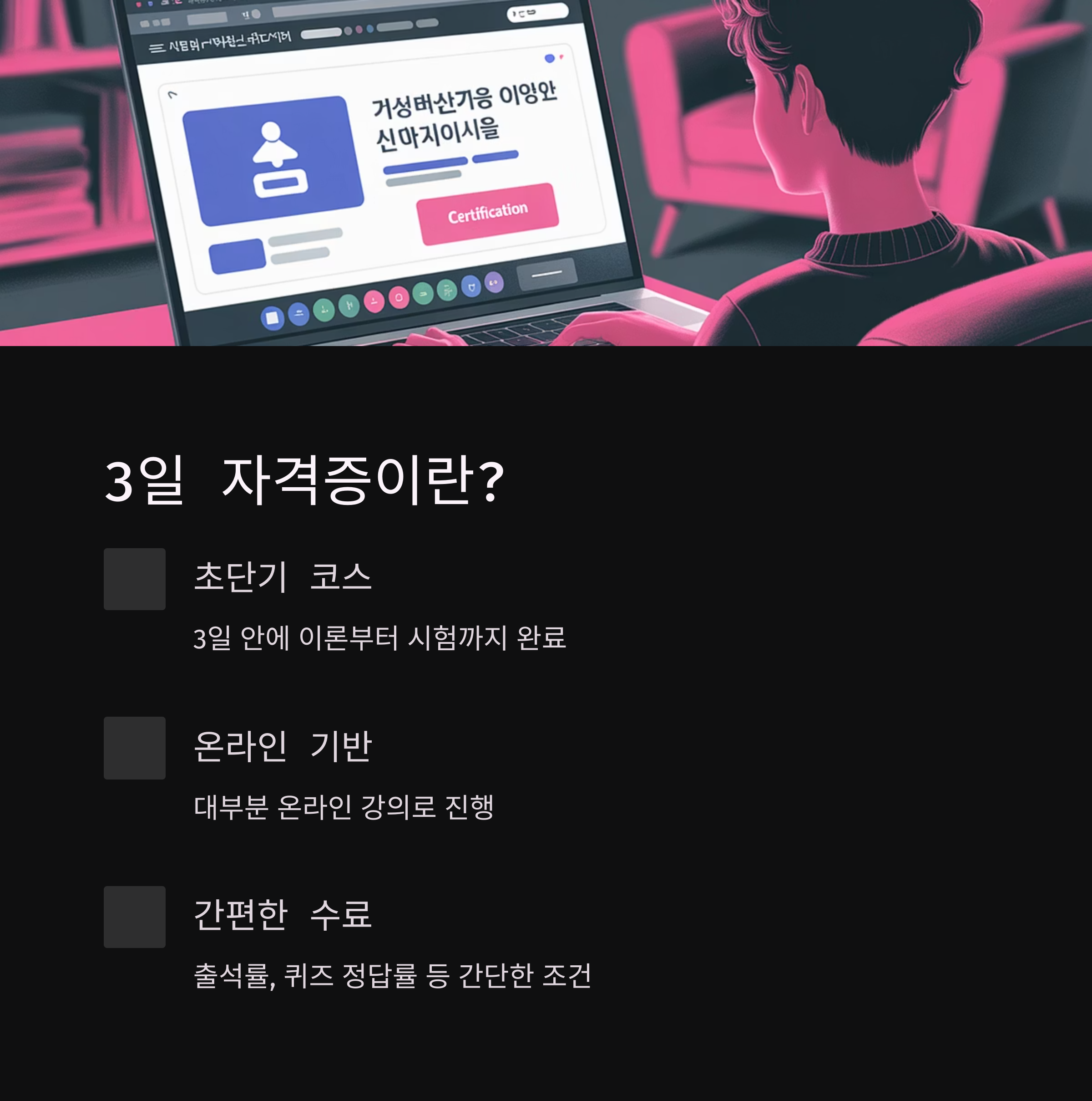 ‘3일 자격증’은 말 그대로 단 3일 안에 이론 수업부터 시험 준비까지 마칠 수 있는 초단기 자격증 코스를 말해요. 주로 온라인 강의 기반으로 이루어지며, 별도의 시험 없이 수료만으로 자격증이 발급되는 경우도 많답니다.
