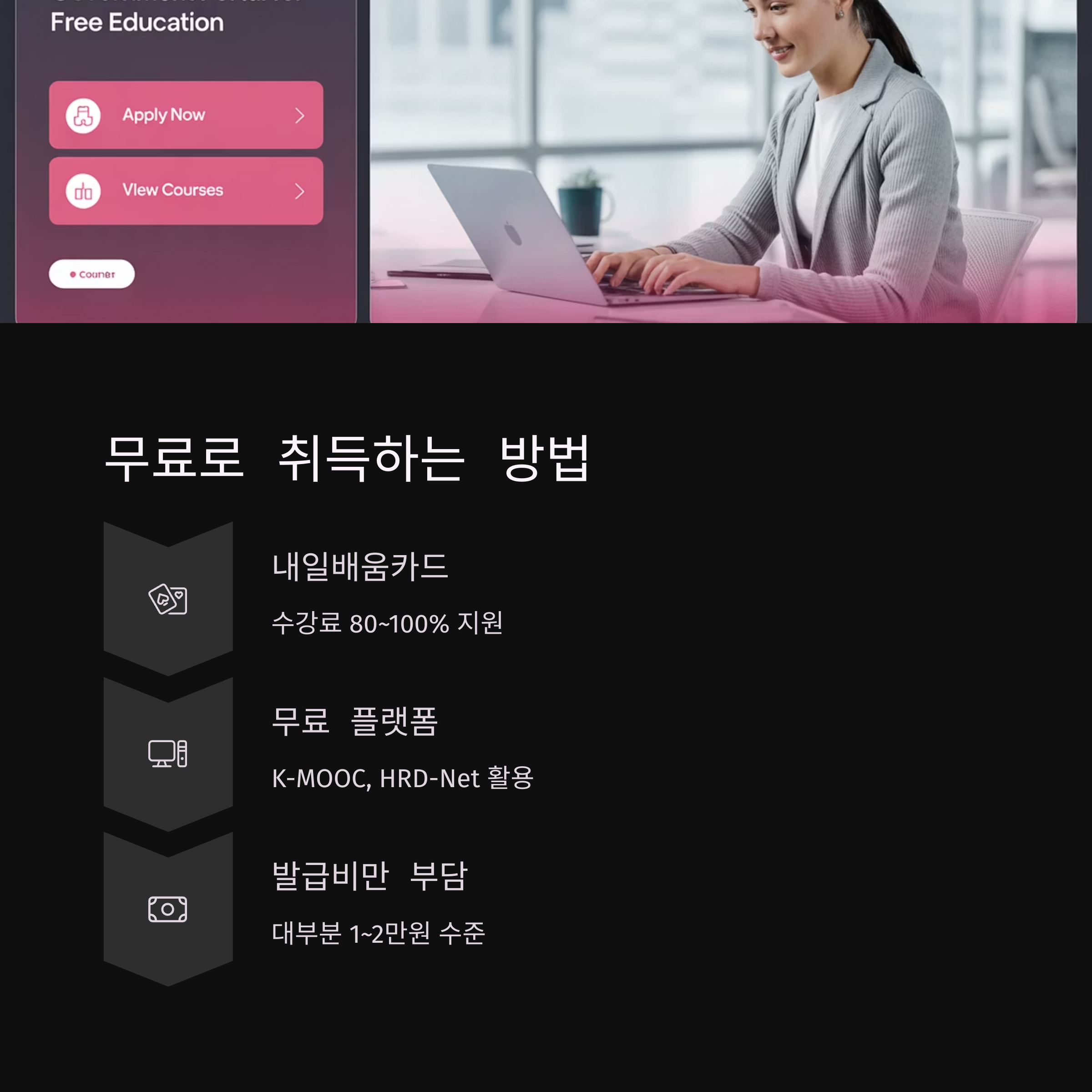 특히 온라인 강의와 무료/국비지원 시스템이 잘 되어 있어서, 시간과 비용이 부족한 사람들도 쉽게 도전할 수 있다는 점이 매력적이에요. 공부에 많은 시간을 투자할 수 없는 분들에게 아주 딱이에요.