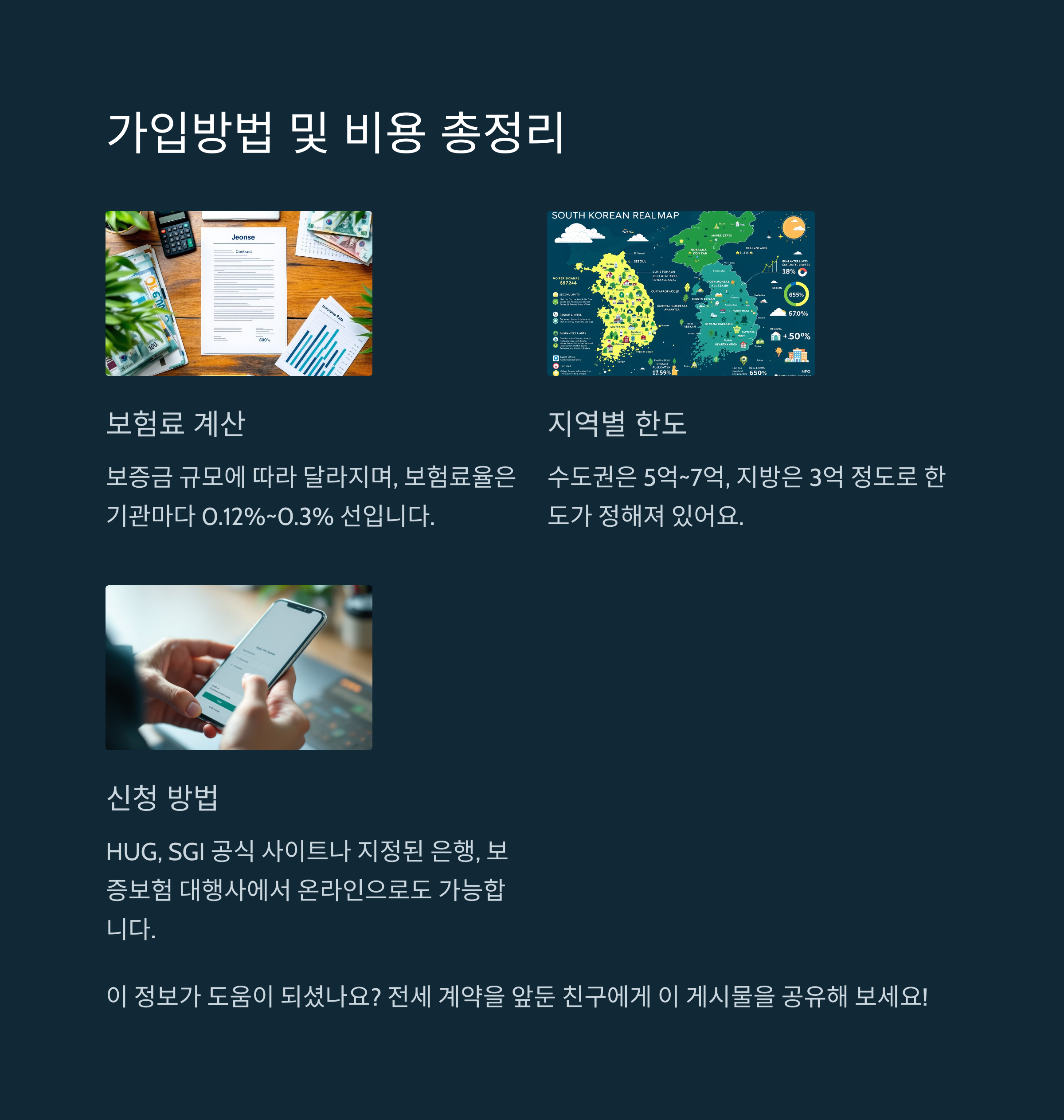보증금한도도 중요해요. 수도권은 5억~7억, 지방은 3억 정도로 한도가 정해져 있기 때문에 초과하는 경우 가입 자체가 불가할 수 있어요.