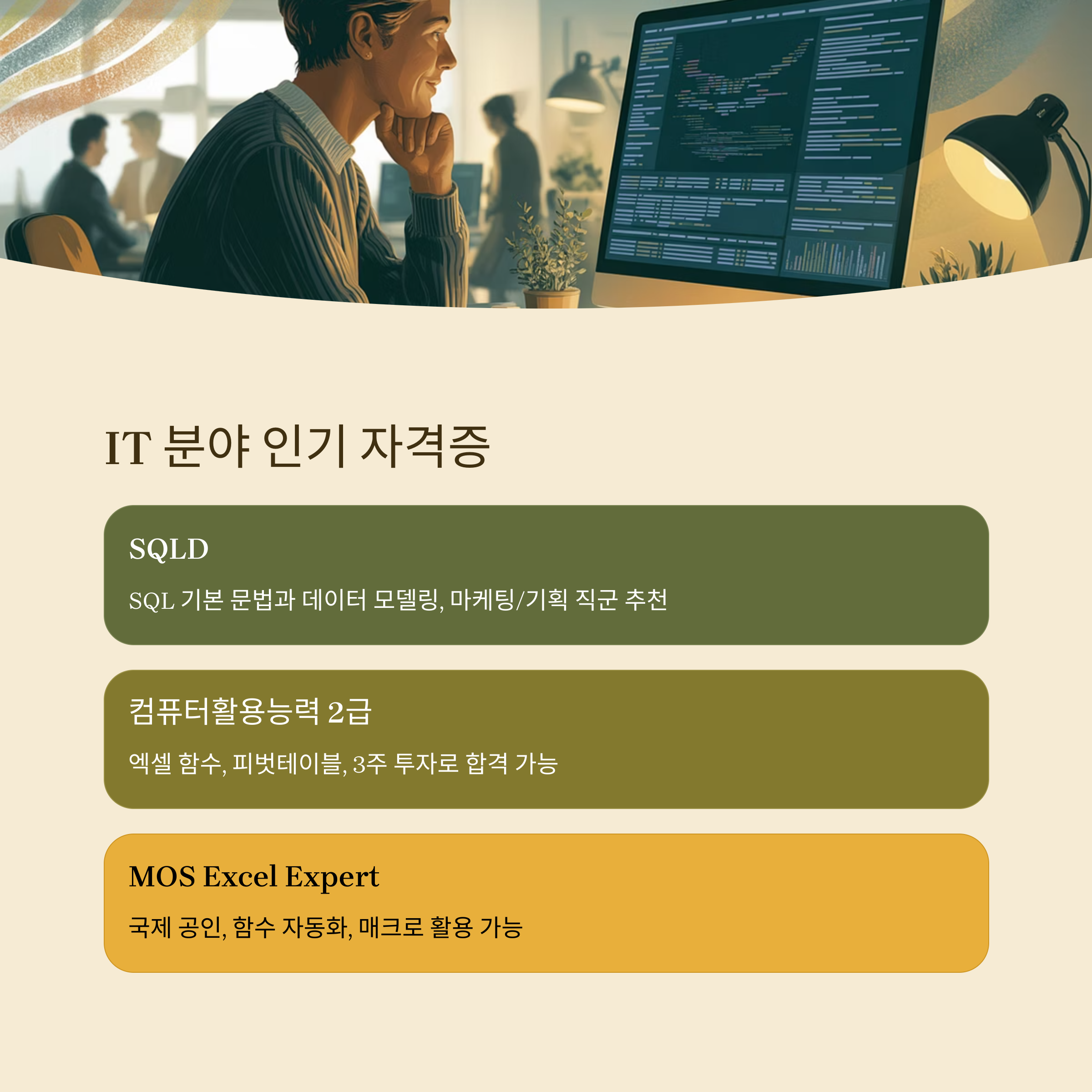 바쁜 일정 때문에 긴 호흡의 공부가 어렵다면, 1~3개월 내에 딸 수 있는 단기 과정이 든든한 안전벨트가 돼요. 경력이 쌓여도 ‘한눈에 보이는 증거’가 없으면 이직 시장에서는 초보 취급받기 쉽거든요. 새로운 팀에 합류할 때 “이 사람은 검증된 스킬을 가졌다”고 말해 주는 라벨이 필요해요. 이때 단기간에 취득 가능한 자격증이 미니멀한 노력 대비 큰 효과를 보여줘요.