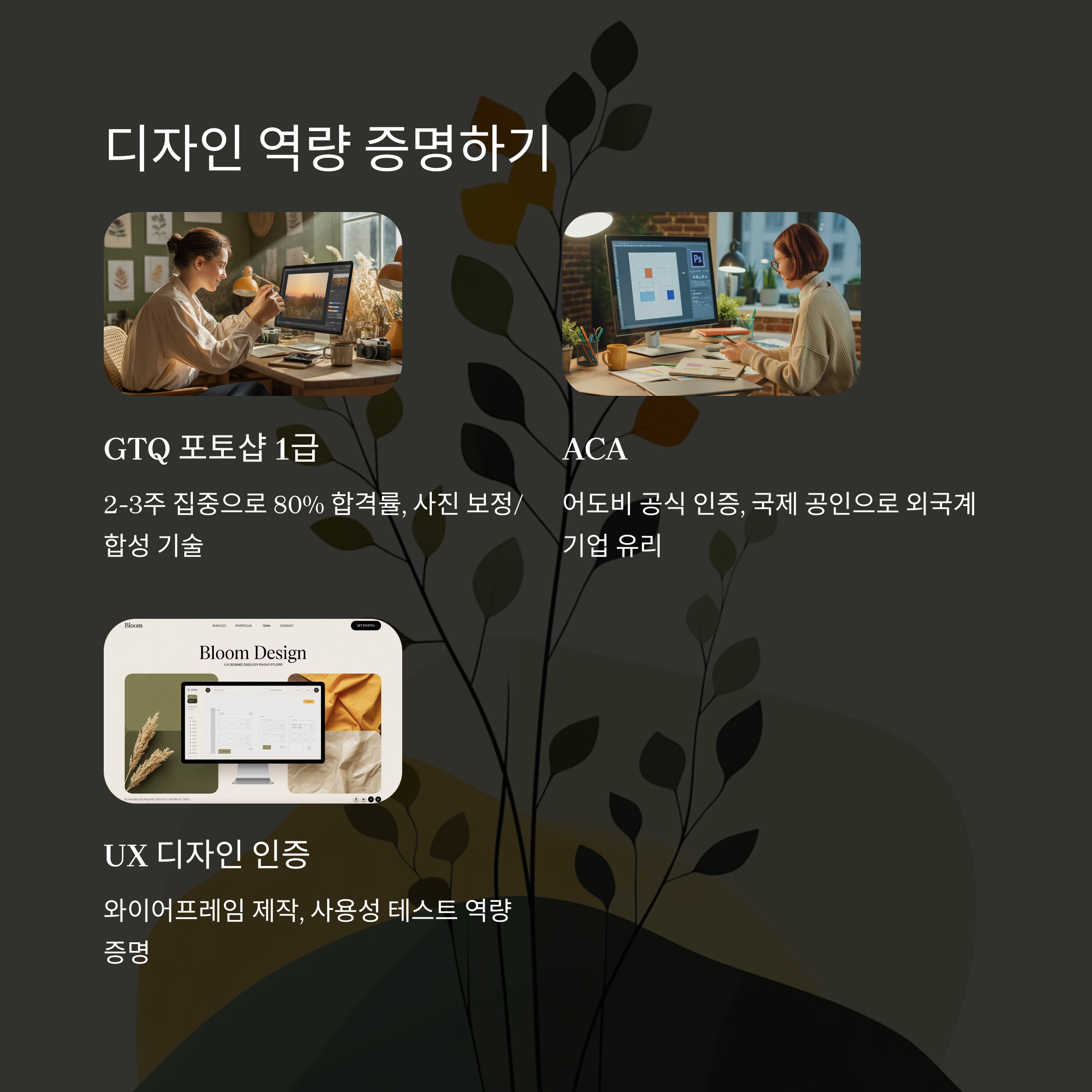 콘텐츠 마케팅·UI/UX 팀은 시각 툴 활용 능력을 높게 평가해요. 첫손에 꼽히는 자격증은 GTQ 포토샵 1급이에요. 사진 보정·타이포그래피·합성 기술을 전 영역 다뤄요. 2~3주 집중하면 합격률 80% 달성할 수 있어요.