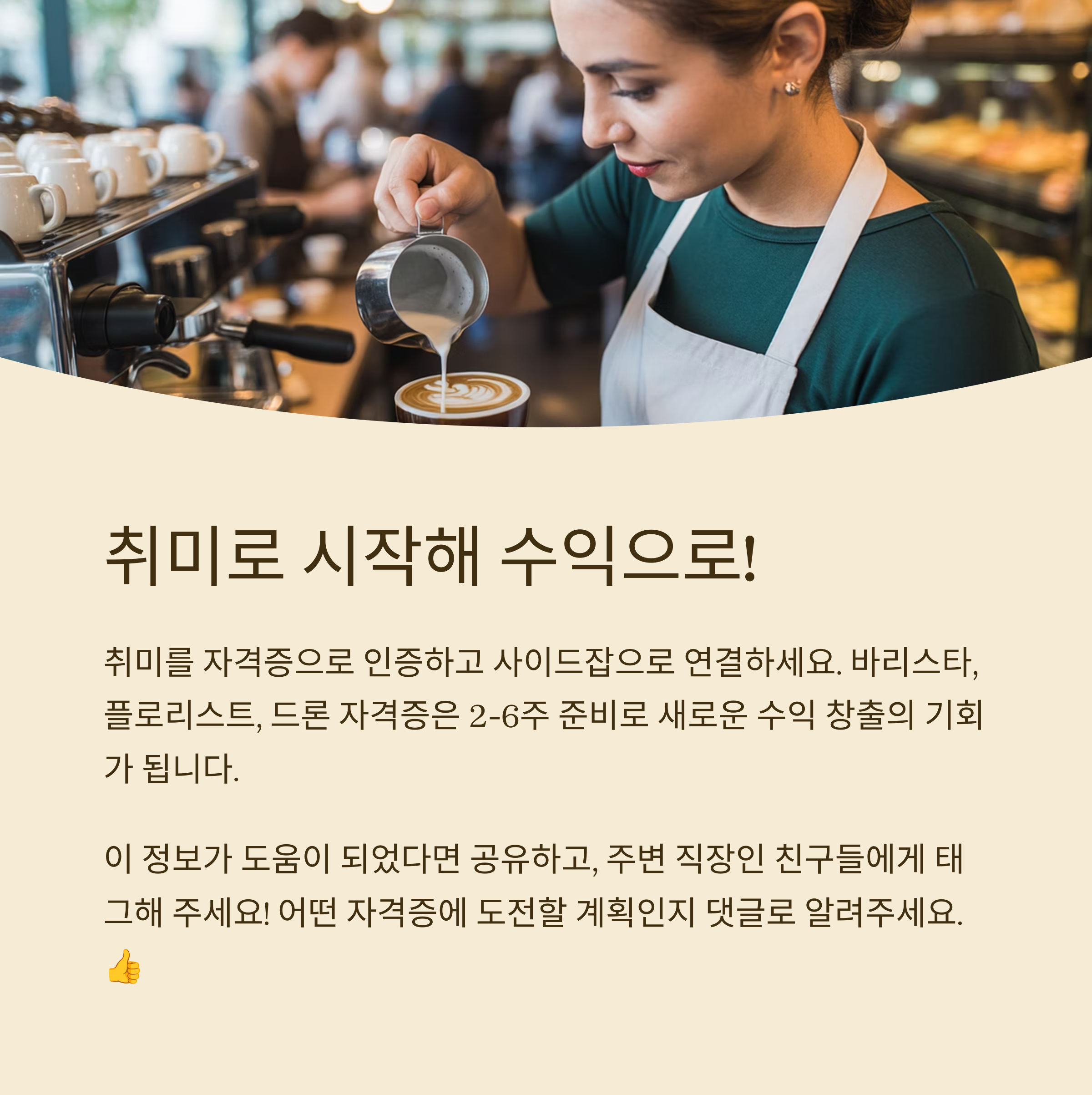 사이드잡 열풍 속에서 취미를 인증해 수익화하려는 움직임이 커졌어요. 첫 번째 추천은 바리스타 2급이에요. 2~3주 실습 과정을 거쳐 에스프레소 추출·우유 스티밍·라테아트 기초를 배우죠. 주말 카페 알바, 사내 카페테리아 운영에도 즉시 적용 가능해요.