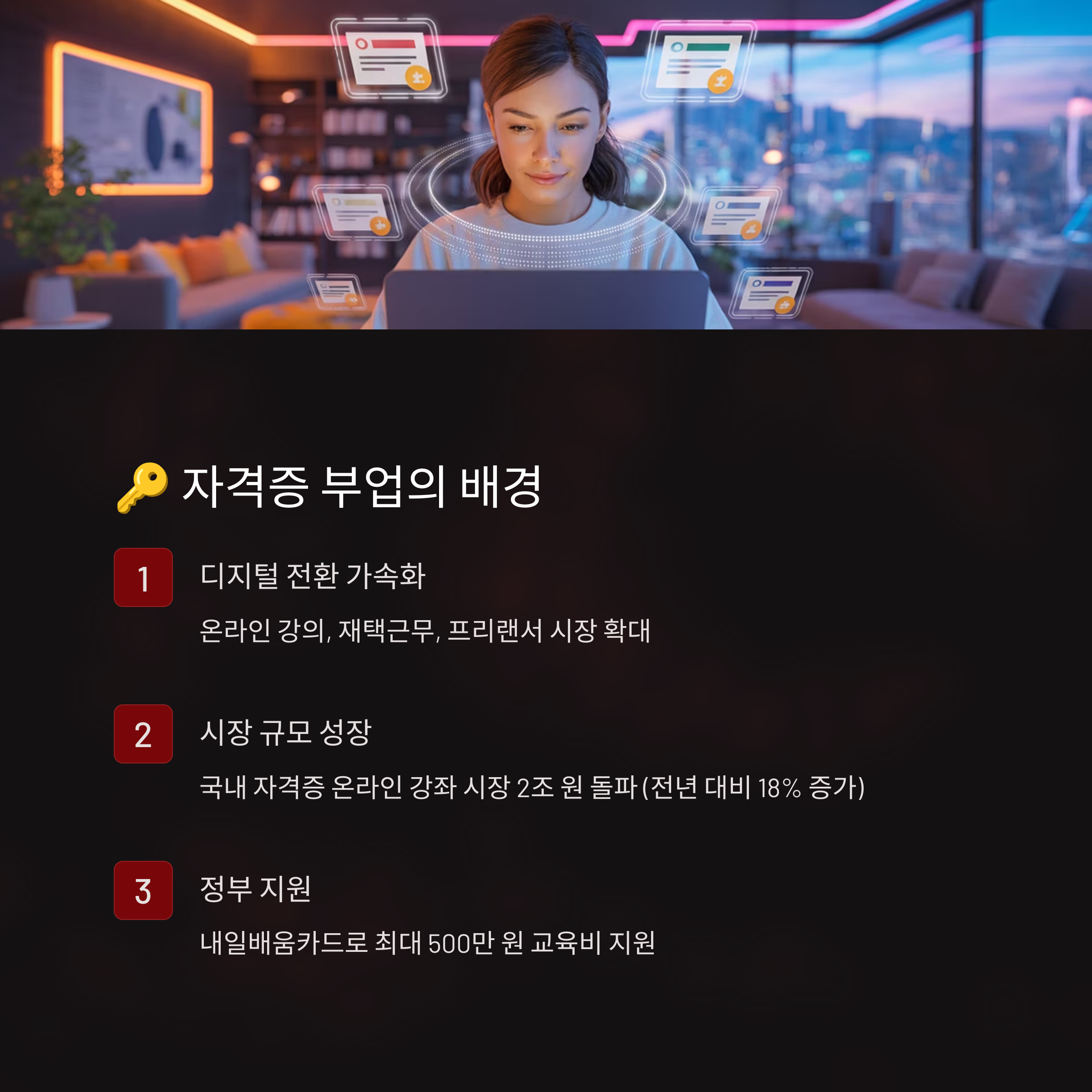 우리나라에서 자격증 시장은 꾸준히 성장해 왔어요. 특히 디지털 전환이 가속하면서 온라인 강의 플랫폼, 재택근무, 프리랜서 시장이 함께 확대되었죠. 자격증은 이런 변화에 발맞춰 본업과 병행하기 좋은 전문성을 제공한다는 점이 강점이에요. 제도권 교육 대신 실무 기술을 빠르게 습득하려는 사람들에게 자격증이 새로운 도전의 문을 열어 주었죠.