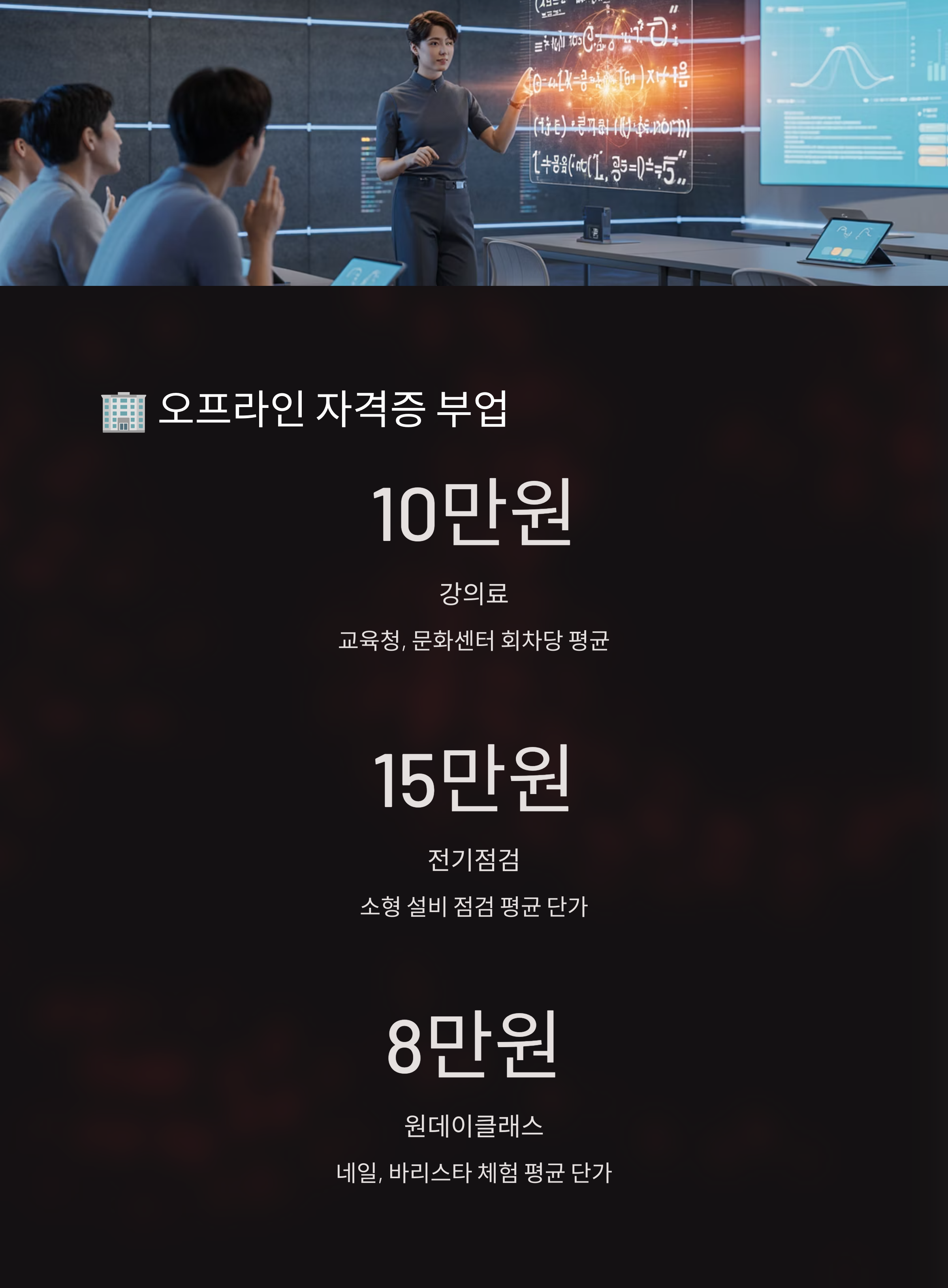 | 분야 | 대표 자격증 | 취득 기간(평균) | 평균 시급 | 부업 형태 |