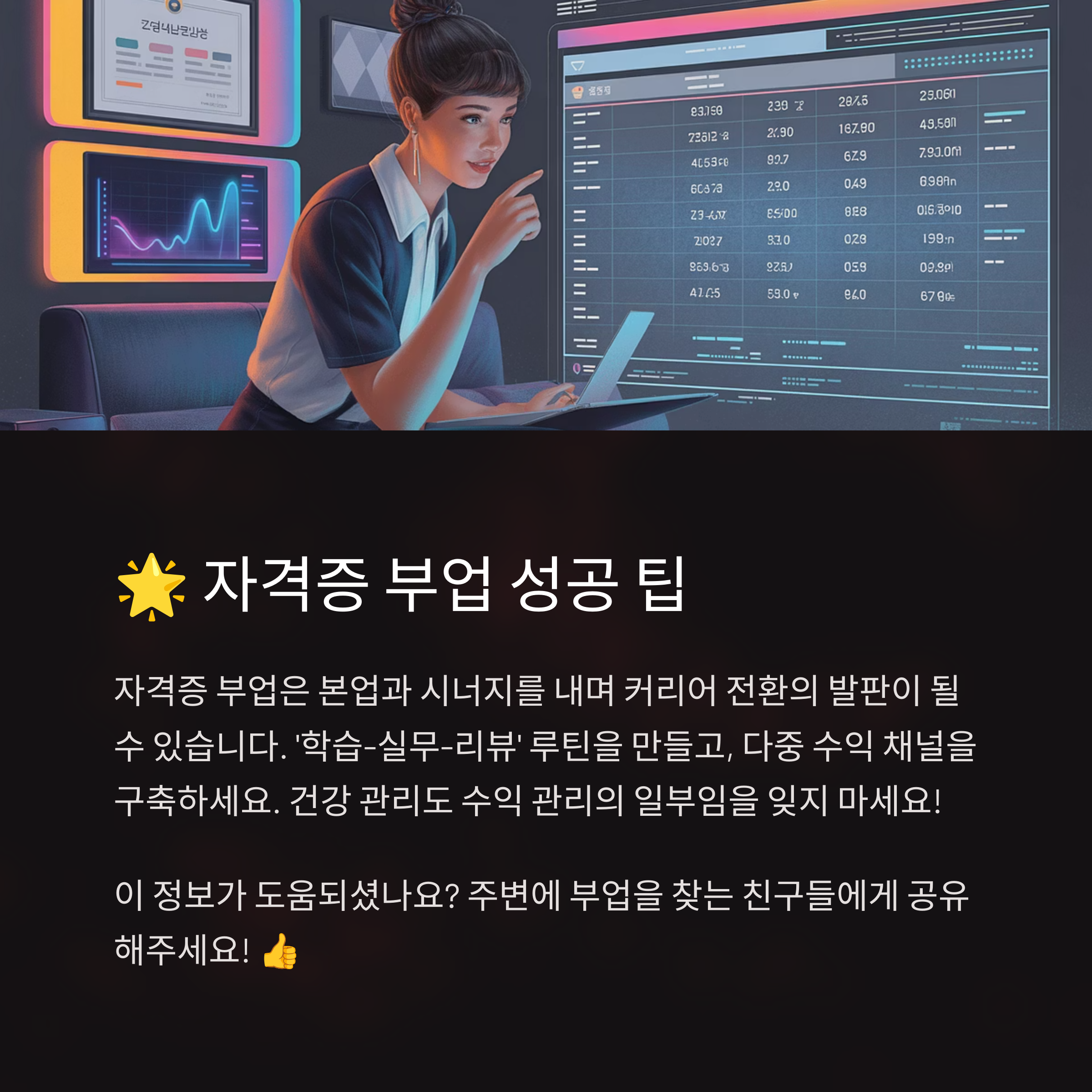 결론적으로 ‘시간이 부족한데 부업이 필요하다’면 자격증 학습은 최적의 선택지가 될 수 있어요. 자격증은 공부 과정 자체가 투자이자 포트폴리오가 되고, 취득 후에는 강의·컨설팅·프리랜스 작업 등 수익 채널을 빠르게 확장할 발판을 제공하거든요. ✨