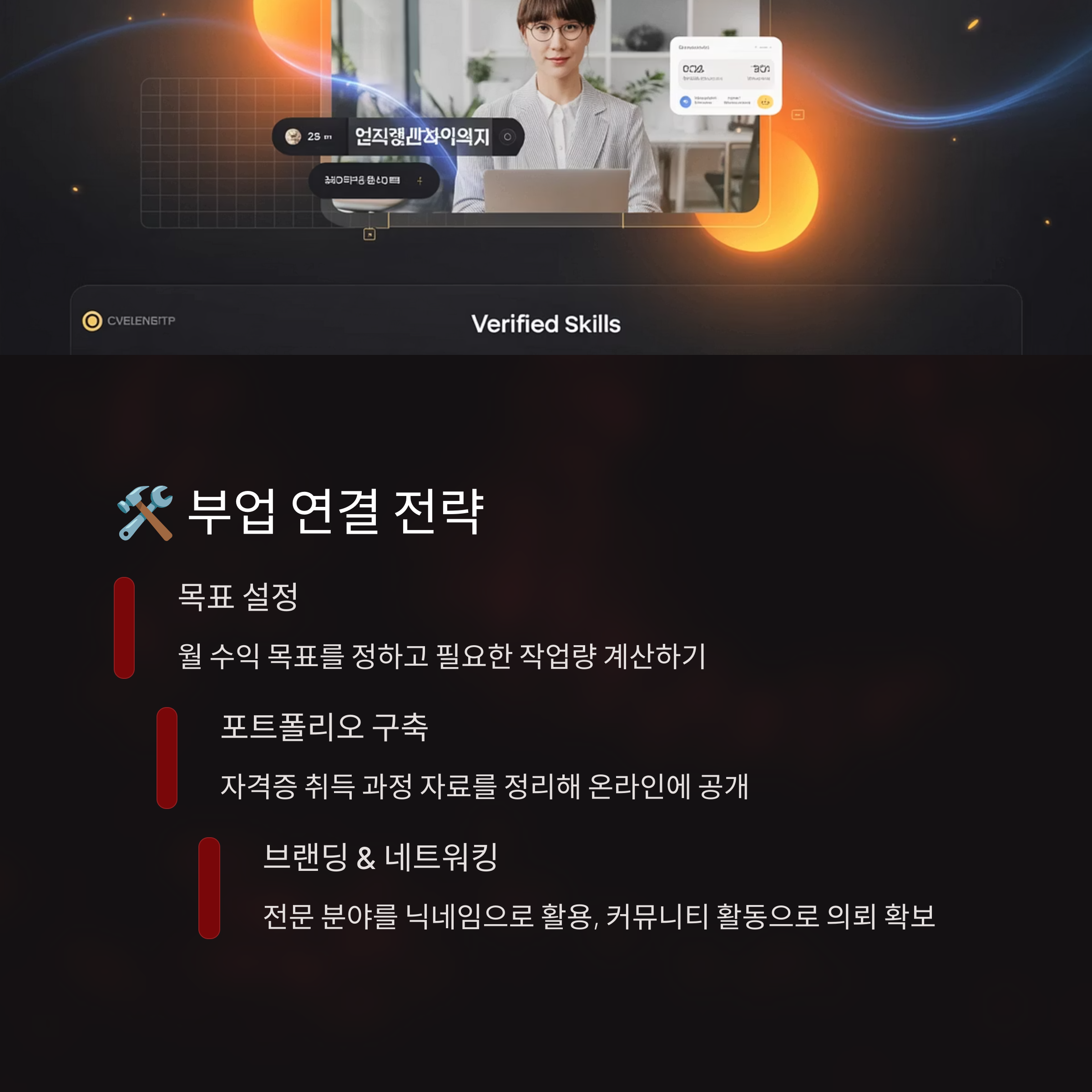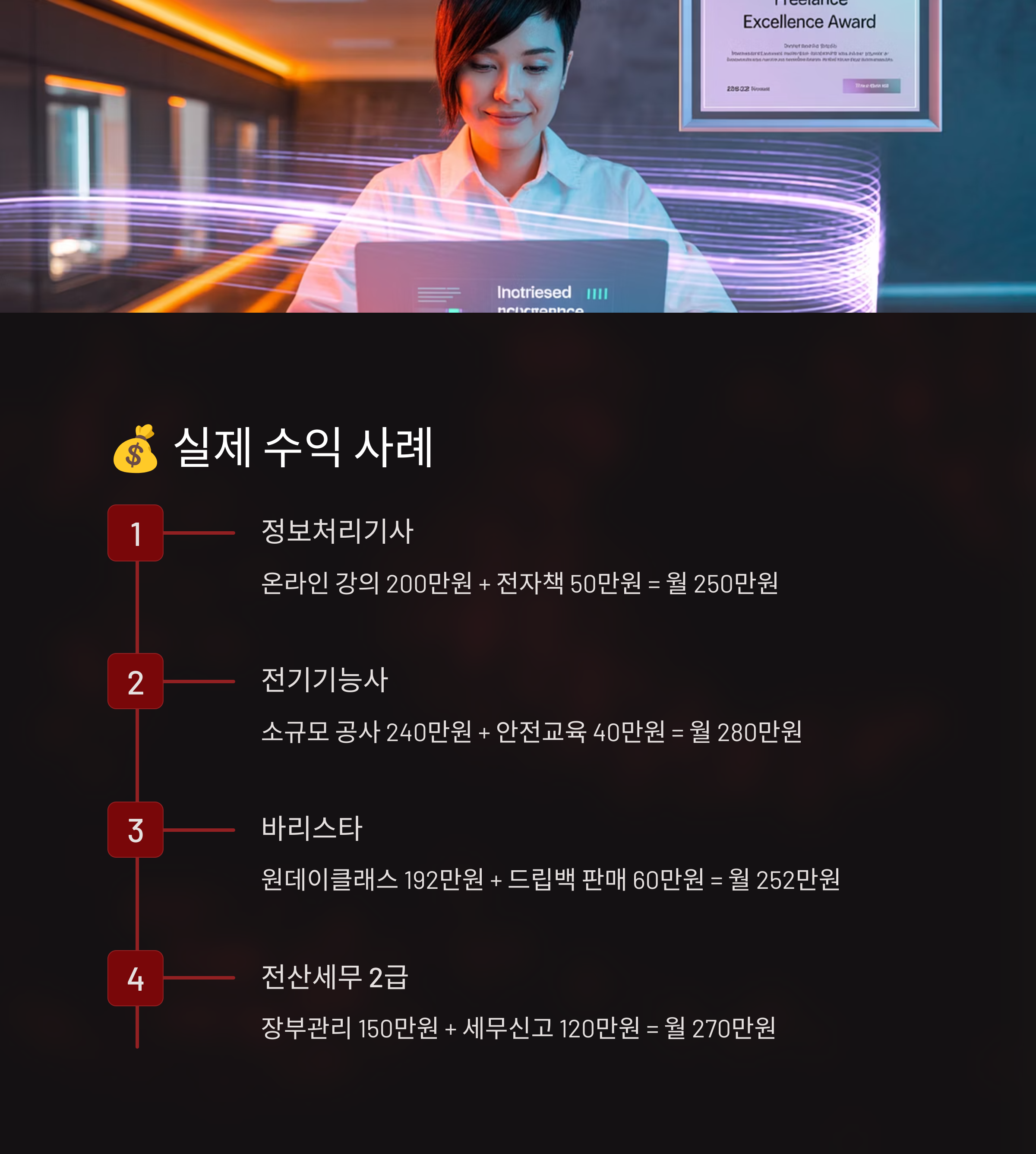 사례를 종합하면 ▲강의·콘텐츠 판매 ▲현장 프로젝트 ▲구독·후원 등 ‘다중 수익 채널’이 성공 포인트예요. 하나의 자격증으로도 세 가지 이상 채널을 설계하면 리스크를 최소화하면서 수익을 극대화할 수 있답니다. 💡