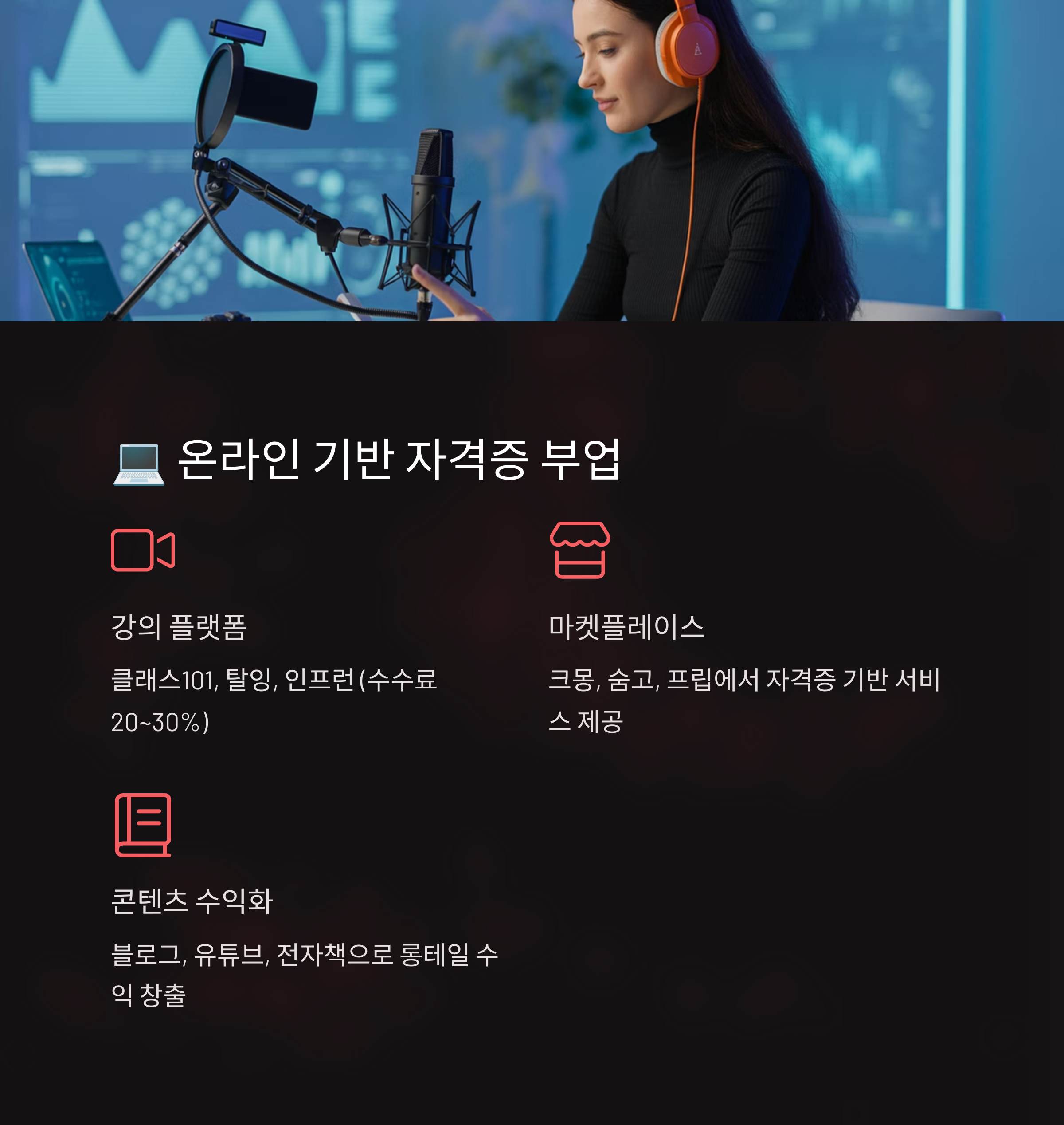 온라인 플랫폼은 자격증 부업 최전선이에요. 클래스101·탈잉·인프런 같은 강의 플랫폼에서는 강의당 평균 20%~30% 수수료를 제외하고 나머지를 강사가 가져가요. 강의 녹화 후 업로드만으로도 수익이 발생하기 때문에 ‘시간당 수익'이 매우 높아져요.
