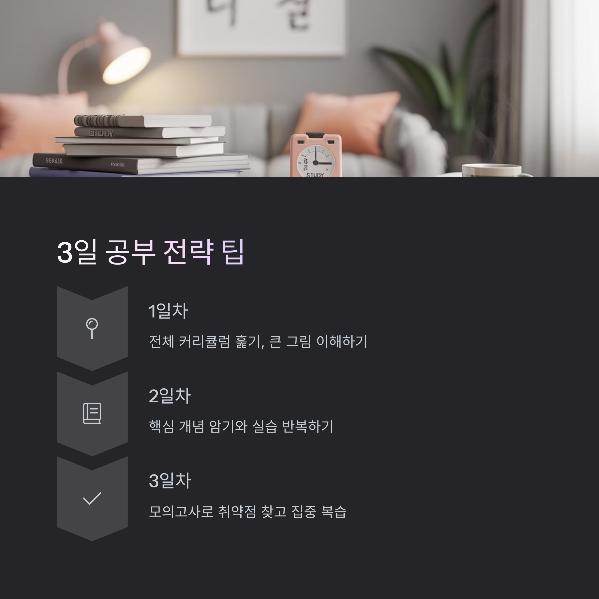 이야기를 통해 확신이 생겼다면, 다음 섹션에서 소개할 ‘3일 공부 전략’으로 속도를 내보세요! 🔥