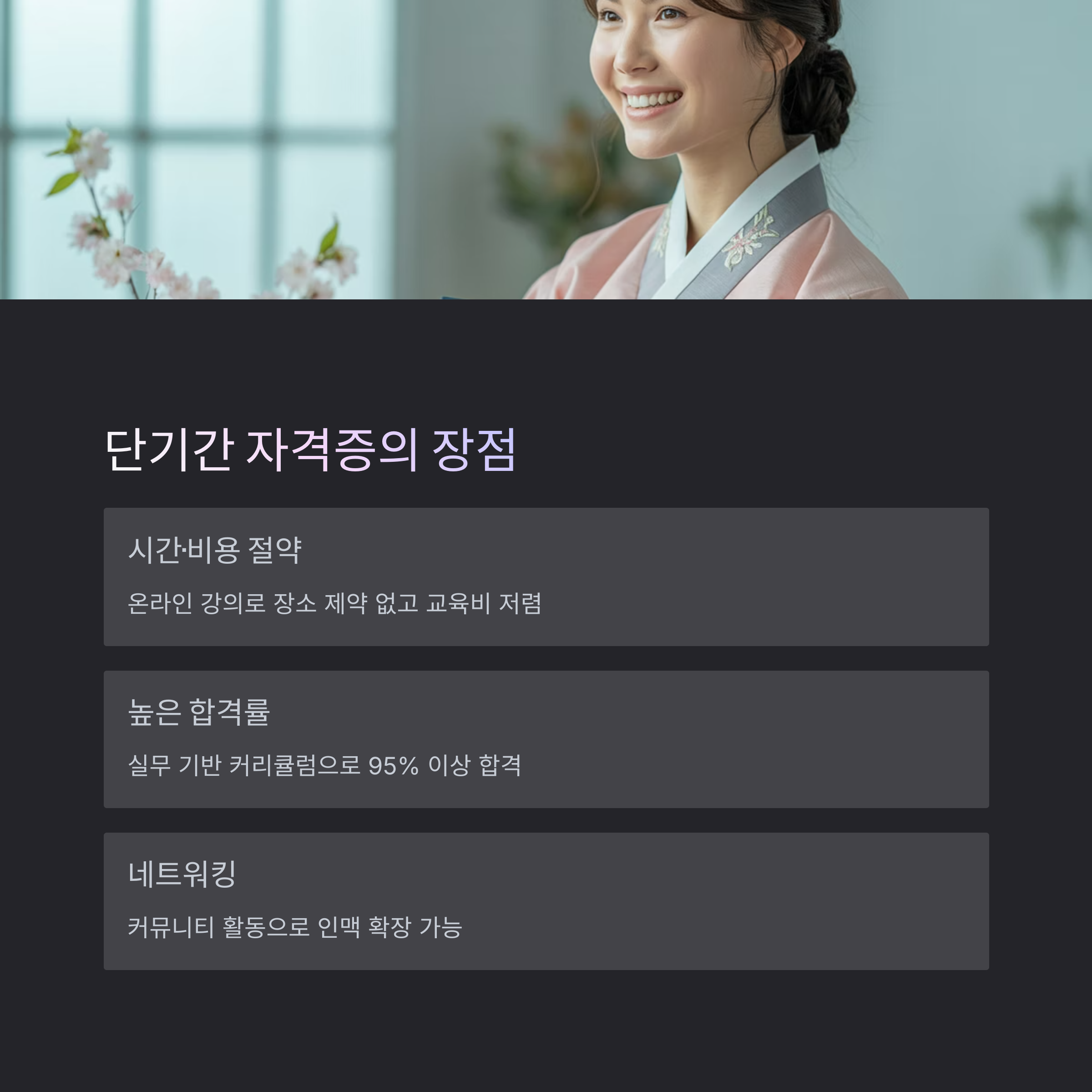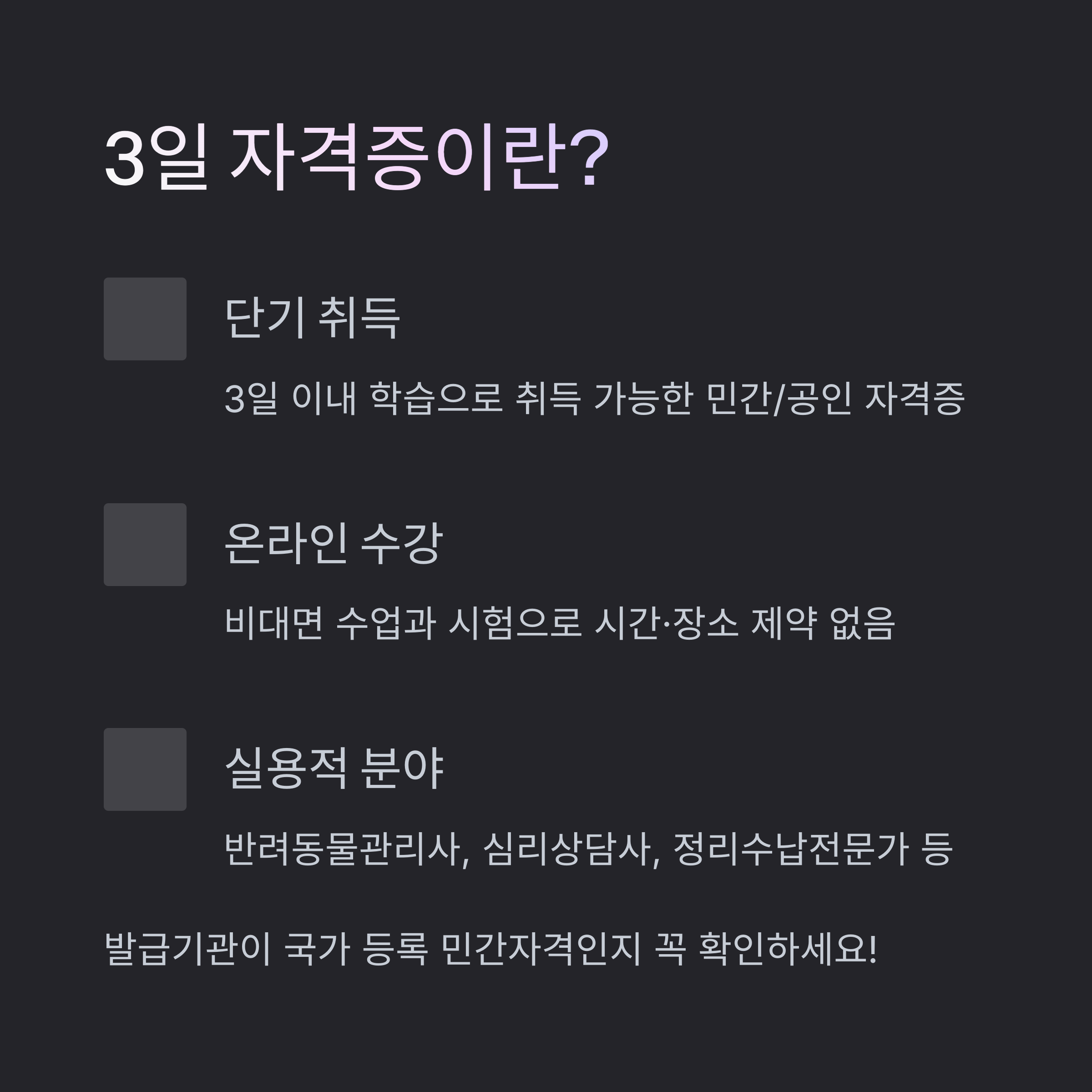 3일 자격증은 적은 시간 투자로 가시적인 성과를 기대하는 사람에게 딱 맞아요.