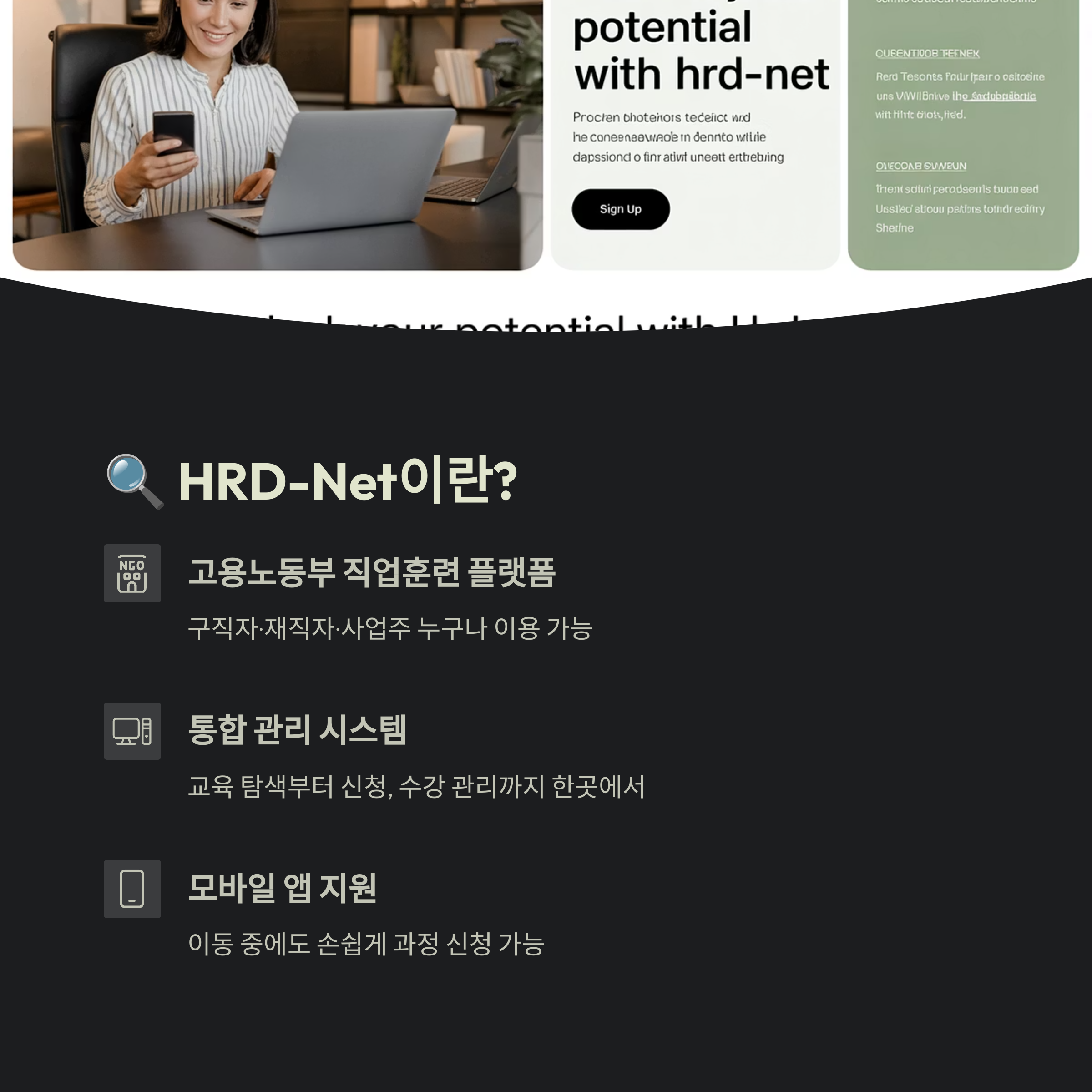 HRD‑Net은 고용노동부가 운영하는 직업훈련 통합 플랫폼이에요. 구직자·재직자·사업주 누구나 온라인으로 훈련과정을 찾고 신청할 수 있죠. 훈련기관, 과정 정보, 훈련비 지원 금액까지 한곳에서 살펴볼 수 있어요. 덕분에 교육 탐색부터 신청, 수강 관리까지 편리하게 이어진답니다.