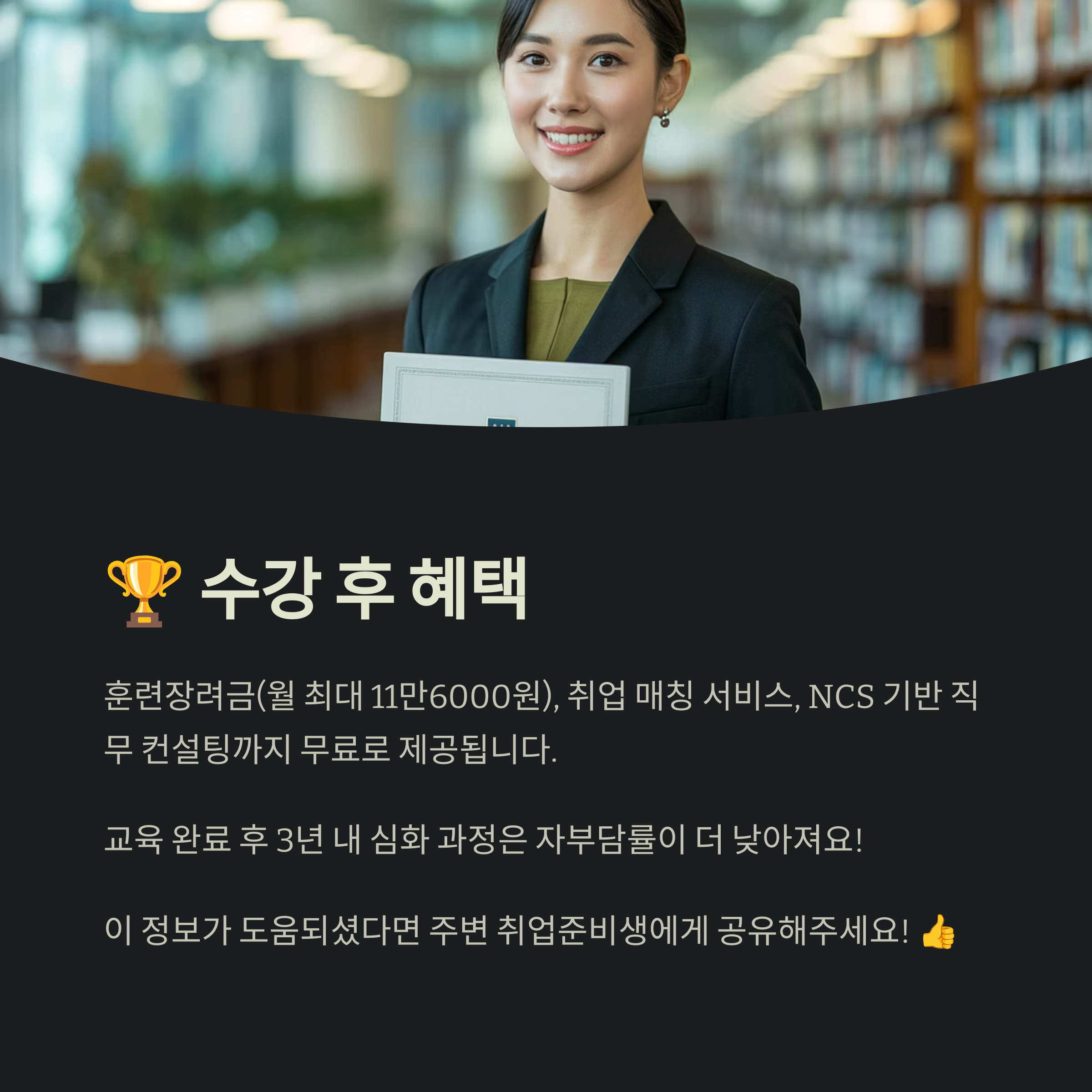 훈련 수료 후 시험까지 응시하면 수강률·성적에 따라 훈련장려금(월 최대 11만6000원)을 받아요. 훈련기관 취업 매칭 서비스, NCS 기반 직무 컨설팅도 무료로 제공돼요. HRD‑Net 내 “이력서 매칭” 기능을 활성화하면 수료 즉시 맞춤형 채용 공고를 이메일로 받을 수 있답니다.