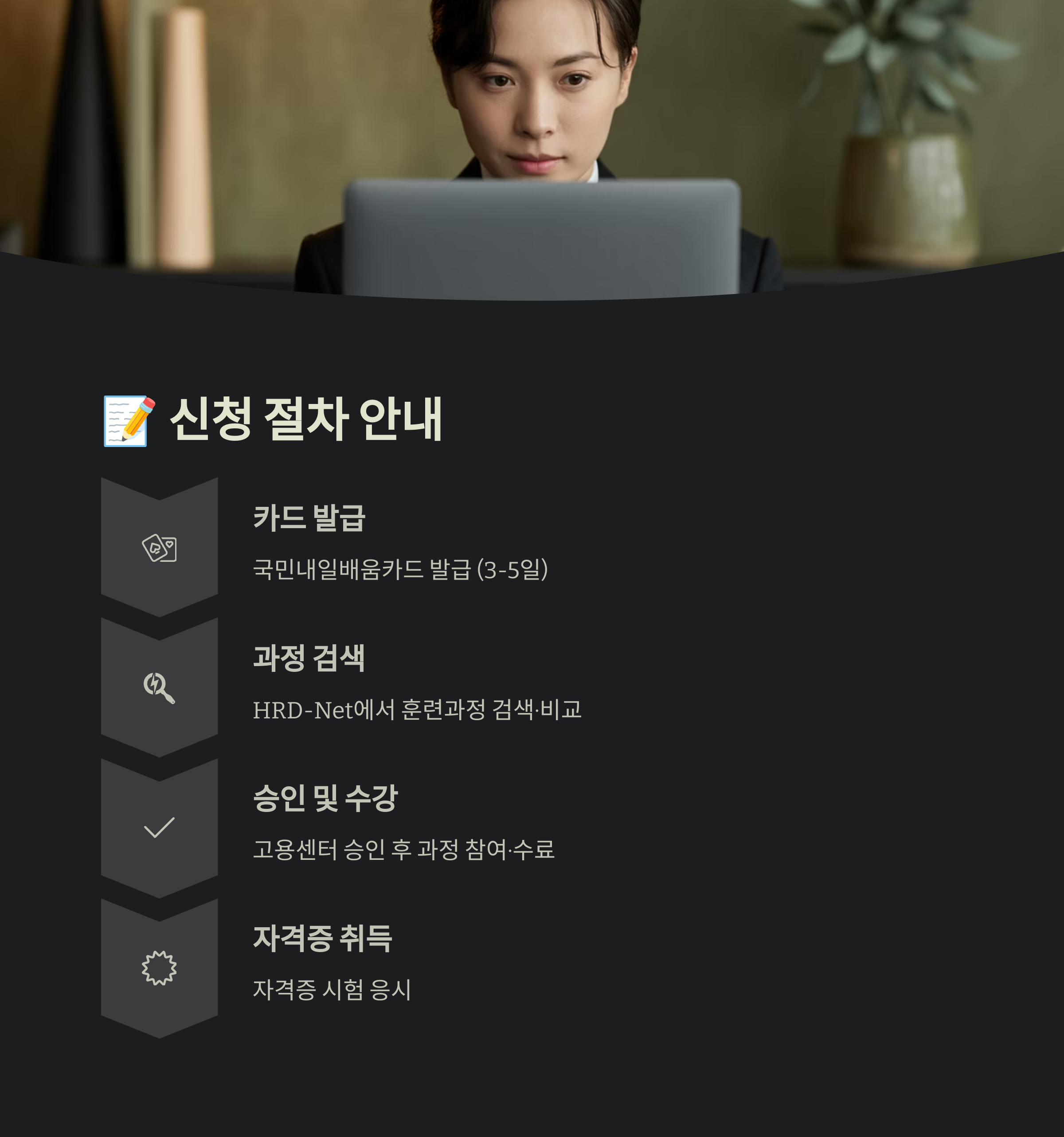 ① 국민내일배움카드 발급 → ② HRD‑Net 회원가입 및 카드 등록 → ③ 훈련과정 검색·비교 → ④ 온라인 수강신청 → ⑤ 고용센터 상담 승인 → ⑥ 과정 참여·수료 → ⑦ 자격증 시험 응시 순서로 진행돼요. 단계마다 온라인 알림톡이 오니 진행 상황을 바로 확인할 수 있어요.