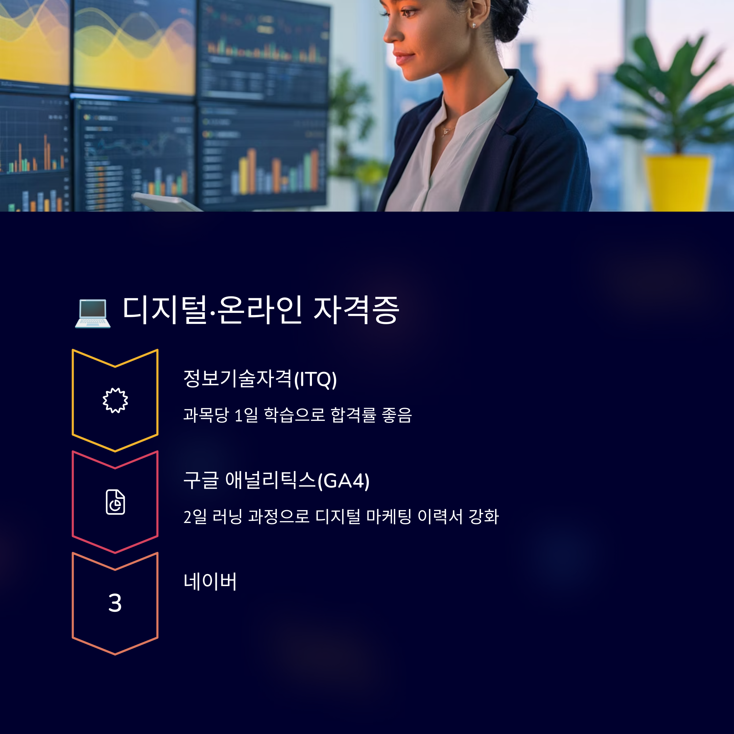 ‘네이버 검색광고마케터’ 자격은 온라인 CBT이고, 모의고사를 반복하면 3일 학습으로 충분해요. 광고 대행사·브랜디드 콘텐츠 제작사 입사 시 강력한 무기가 돼요.