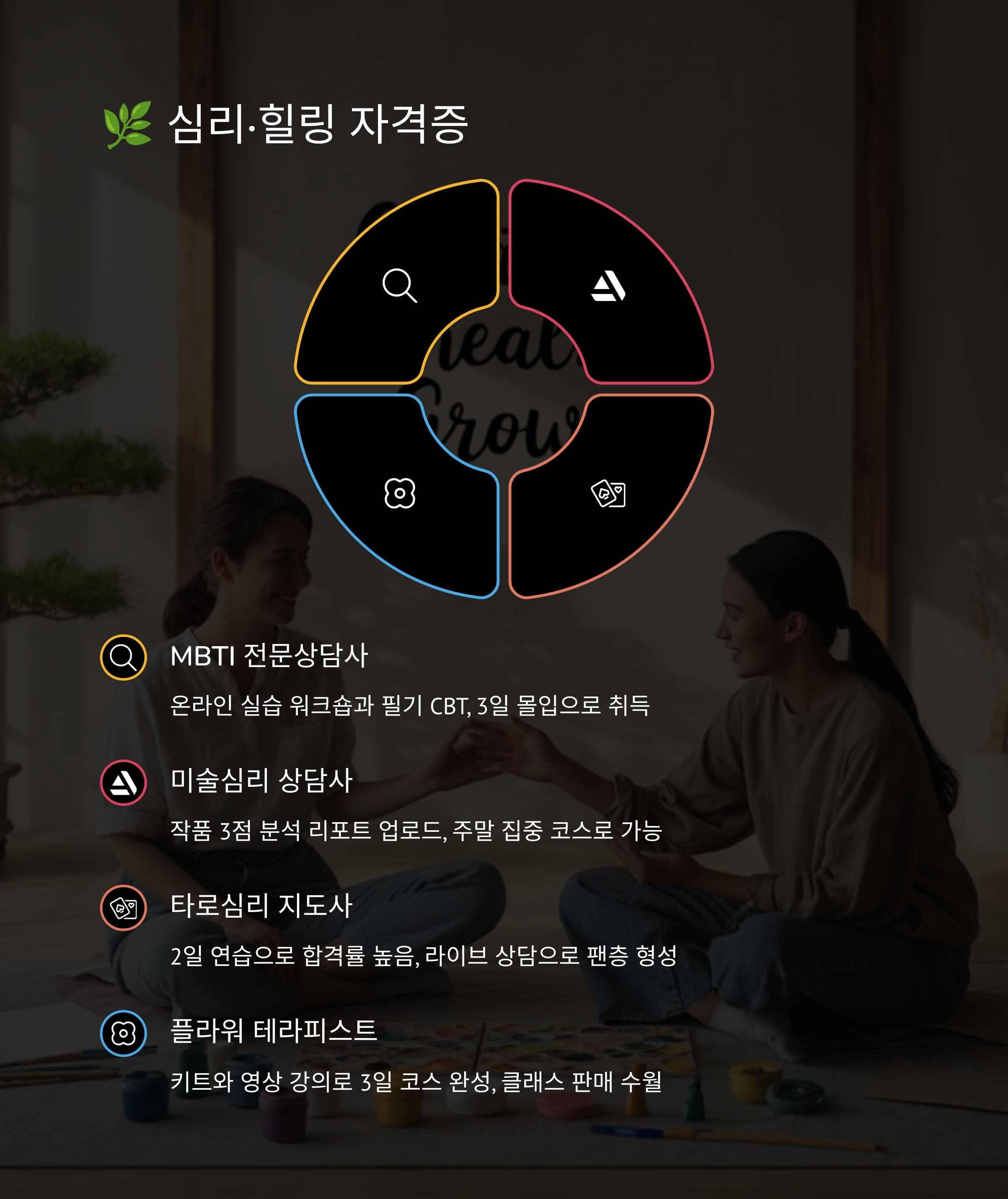 심리 치유 콘텐츠는 코로나 이후로 급성장했어요. ‘MBTI 전문상담사’ 민간 자격은 온라인 실습 워크숍과 필기 CBT로 구성돼요. 실습 비중이 커도 교안·영상이 체계적이라 3일 몰입이면 충분해요.