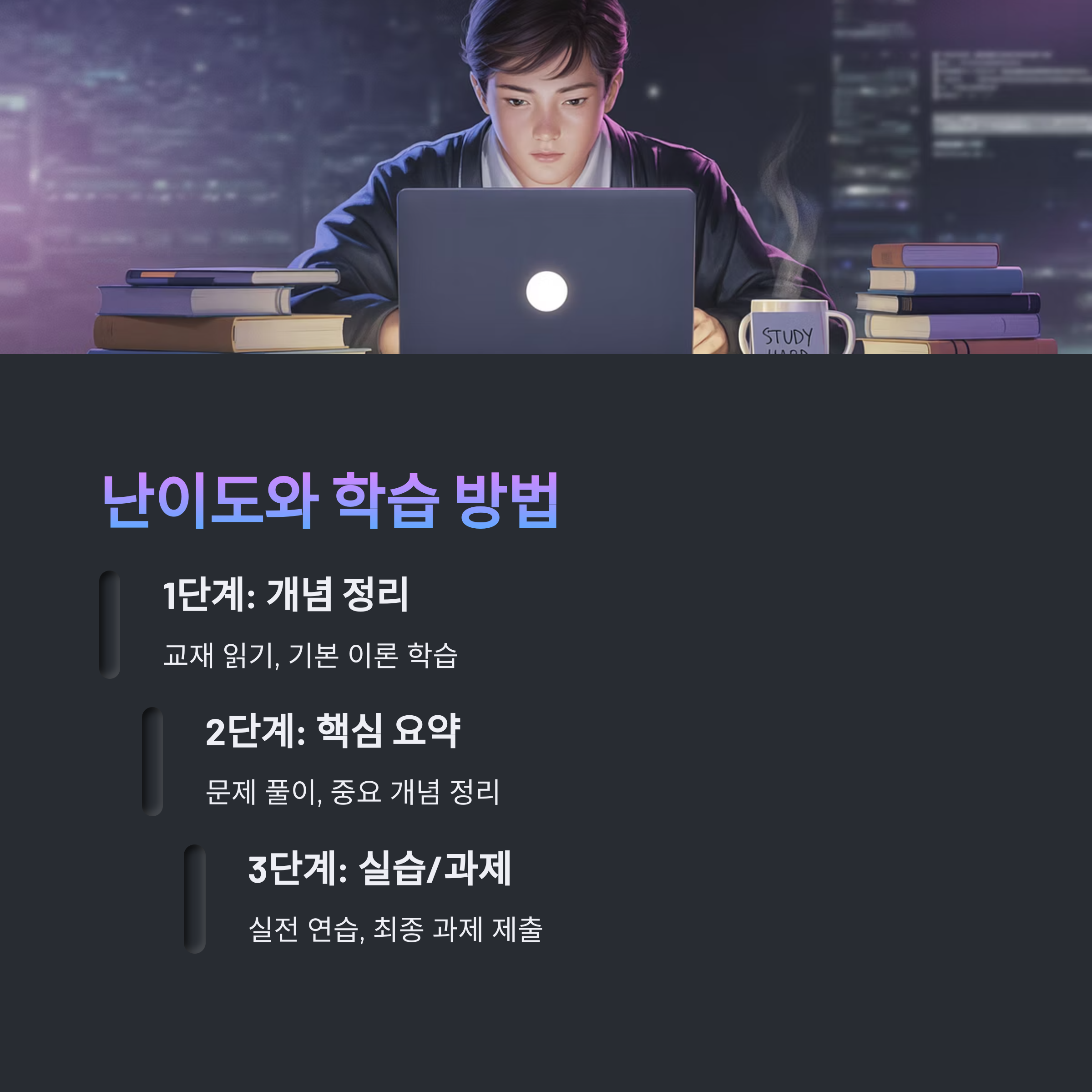 공부 방법은 크게 3단계로 나뉘어요. 1단계는 개념 정리 및 교재 읽기, 2단계는 핵심 요약 정리와 문제 풀이, 마지막 3단계는 실습이나 과제 제출이에요. 시간 배분이 가장 중요하므로 하루 2~3시간 정도 투자해서 영역별로 나눠 공부하는 게 좋아요.