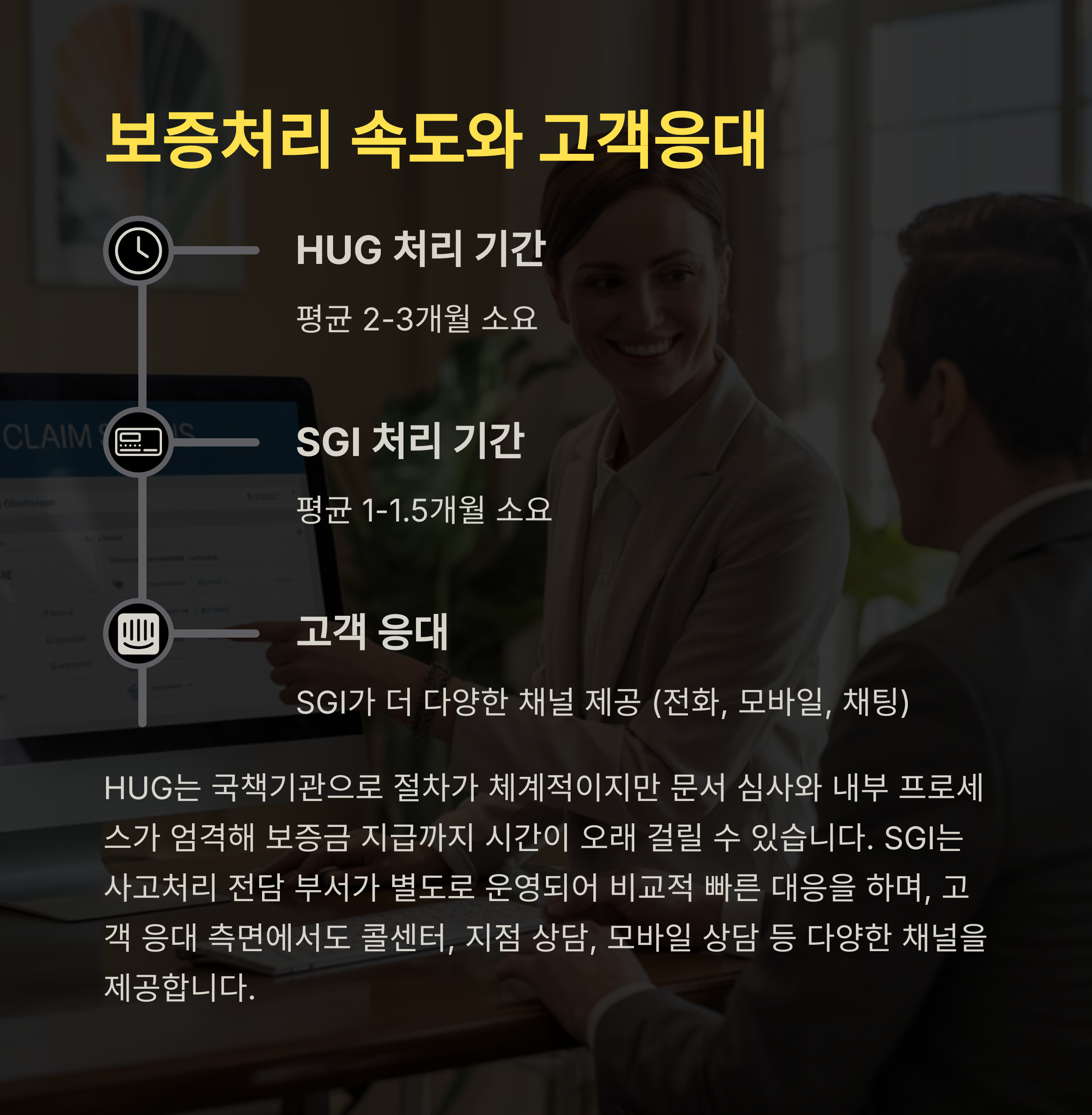 사고 처리의 속도와 대응은 세입자 입장에서는 정말 중요한 요소예요. 특히 퇴거 직전까지 보증금 반환이 안 되는 상황이라면 하루하루가 초조하니까요. 그런 점에서 SGI는 신속한 응대 면에서 더 좋은 평가를 받고 있어요.