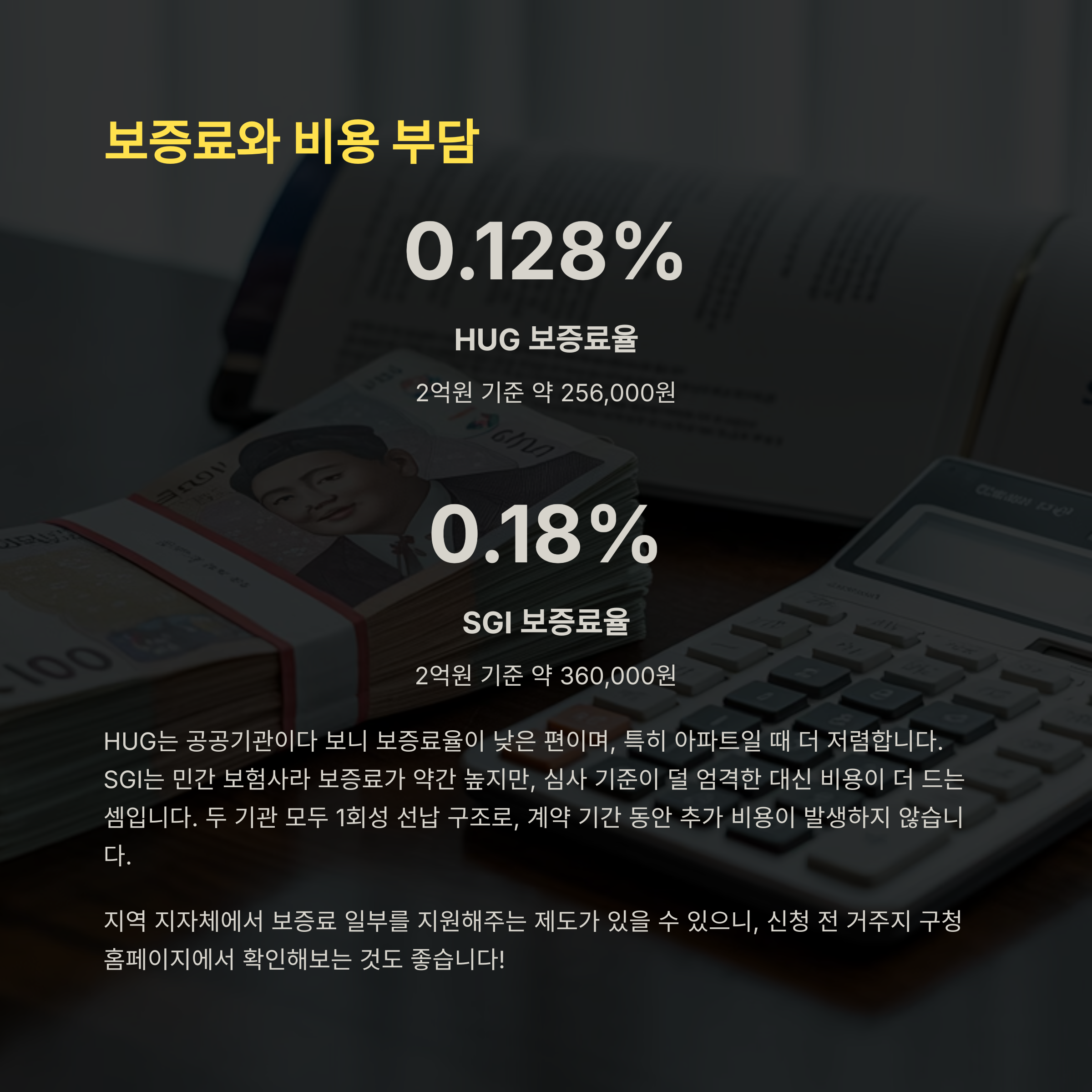 반면 SGI는 민간 보험사라 보증료가 약간 높은 편인데요, 보통 0.15~0.2% 사이에서 결정돼요. 조건이 까다롭지 않은 대신 비용이 좀 더 드는 셈이죠.