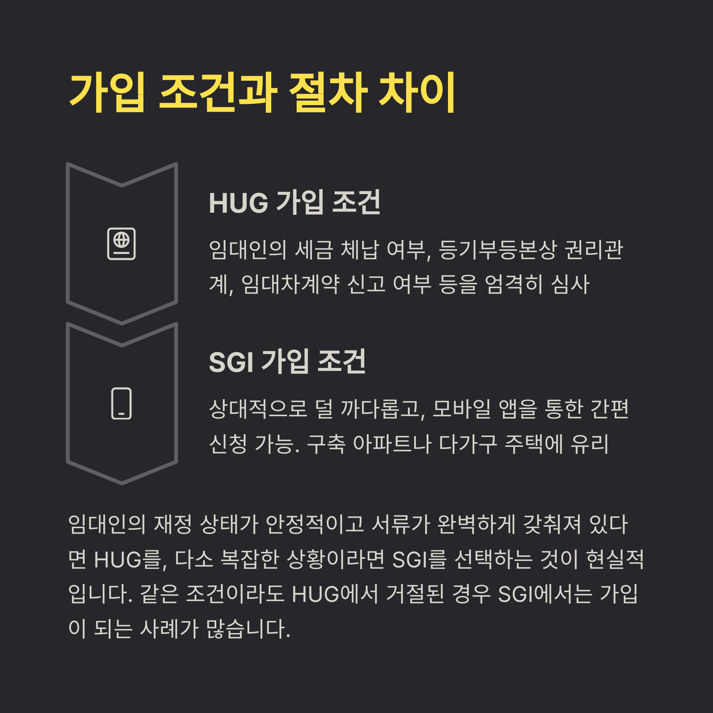 지금까지 살펴본 것처럼 HUG와 SGI는 전세보증보험이라는 공통 목적을 가지고 있지만, 각각의 성격과 장단점이 꽤 분명해요. 그래서 ‘어떤 보험이 더 낫다’는 질문에는 정답이 딱 하나 있는 게 아니라, 조건별로 선택 기준이 달라져요.