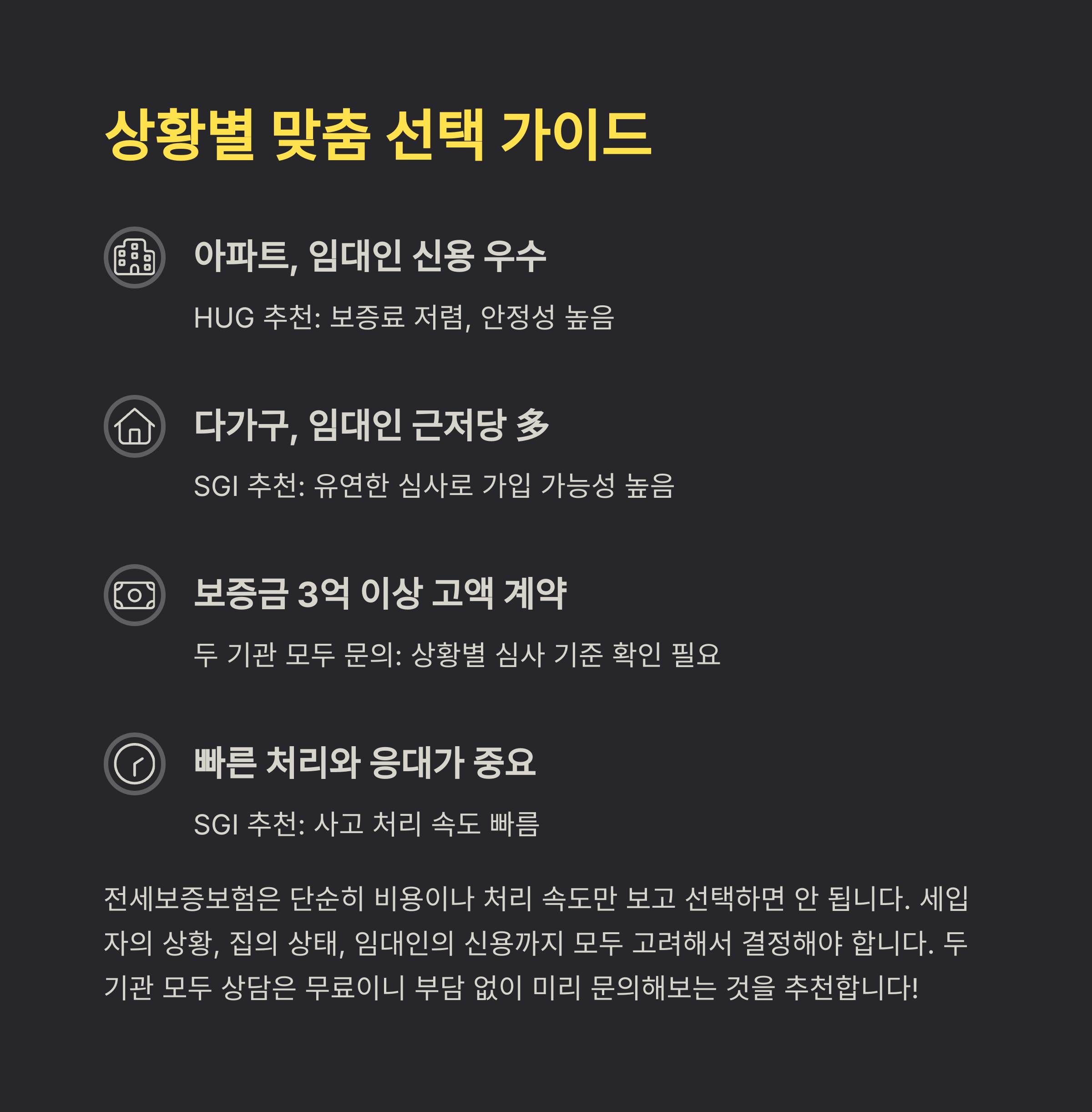전세보증보험은 단순히 '비용이 싸니까', '처리가 빠르니까' 한 가지만 보고 선택하면 안 돼요. 세입자의 상황, 집의 상태, 임대인의 신용까지 모두 고려해서 결정해야 안전하답니다.