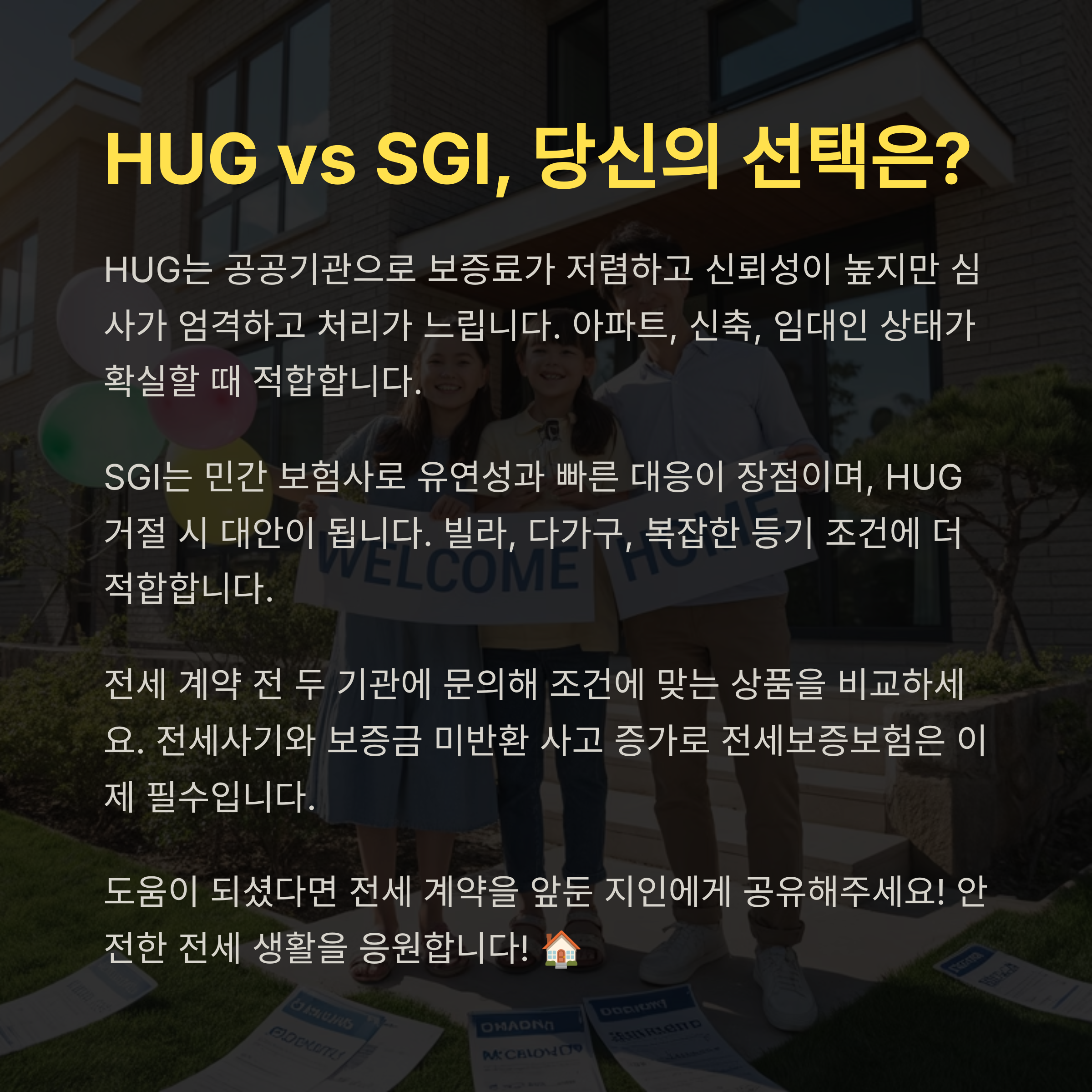 결론적으로 임대인의 재정 상태가 안정적이고 서류도 완벽하게 갖춰져 있다면 HUG를, 다소 복잡한 상황이라면 SGI를 선택하는 게 현실적인 선택이에요.